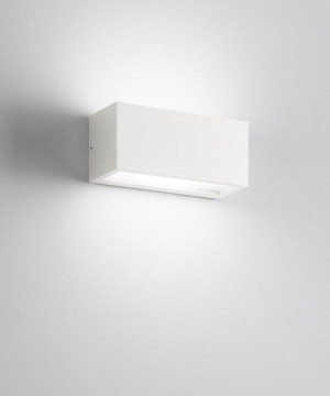 Lampade da parete due luci e plafoniera in alluminio pressofuso dalla linea tondeggiante di forte impatto, utilizzata come valorizzatore architettonico e ambientale grazie alla sua spettacolare eleganza. Illuminazione a LED 230V con alimentatore integrato. Luce diretta con diffusori in vetro trasparente. LED 10W+10W (COB ø 10.5mm 1+1pcs) nella versione a due luci piccola. Finiture colori: bianco goffrato, grigio antracite goffrato, corten goffrato e alluminio goffrato. Disegnata per ambientazioni esterne ma spesso utilizzata anche in spazi interni come saloni di rappresentanza e corridoi.Classe energetica A++, A+, A.